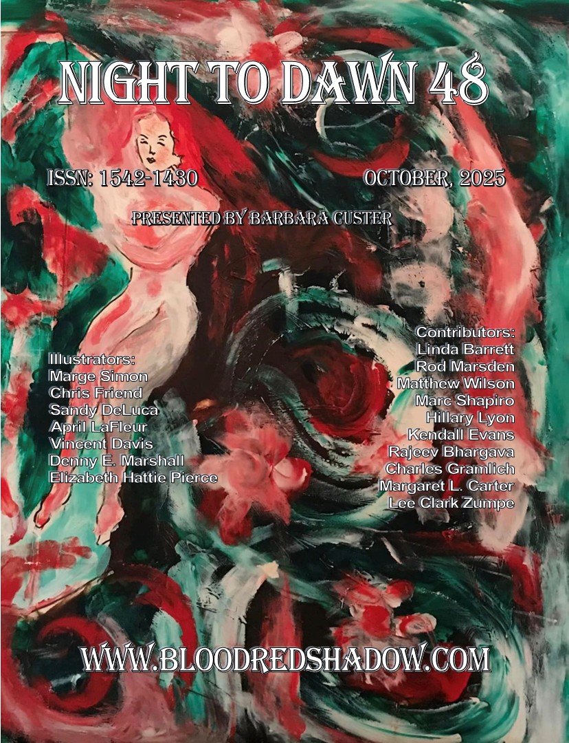 Night to Dawn 48 delivers horror and science fiction with a humorous twist, as in Matthew Wilson’s “Diet or Die;” the unspeakable, as in Hal Kempka’s “Turkey Shoot;” and occasionally, a happy ending, such as Charles Gramlich’s “Soft They Were, and Broken.” Happy or grim, the stories will keep you up at night, reading to their satisfying conclusions. The collection of short stories, poetry, and illustrations, presented by Barbara Custer, includes: