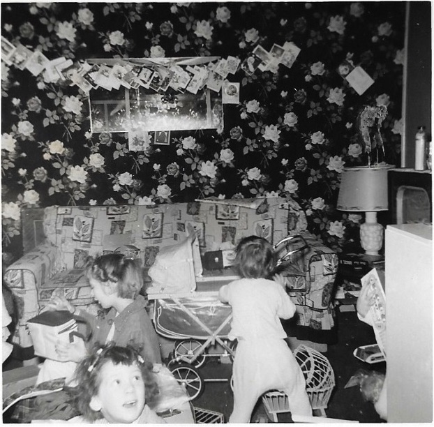 I grew up surrounded by siblings. Four girls and one boy were crowded into a tiny house in the middle of nowhere, Ohio and money was always tight. Despite our circumstances, we always looked forward to Christmas and our presents. Mom and Dad managed to stretch every dollar and interspersed practical gifts like a new lunch pail and saddle shoes with a doll cradle and a baby carriage. I don’t remember much about the presents, but I do remember the warm family that surrounded me. Here’s a picture of us digging into our gifts.